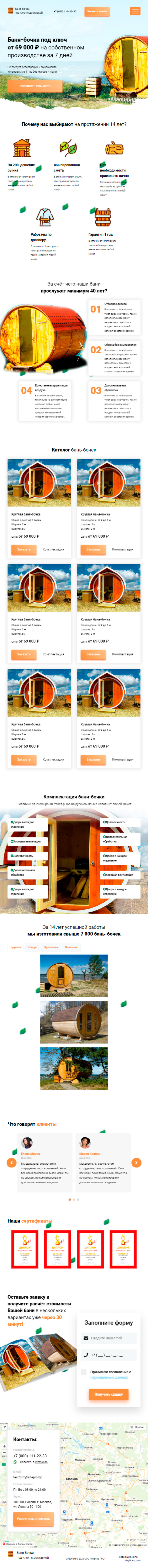 Закажите готовый продающий сайт лендинг #2172204 в Калининграде за 1-3 дня «под ключ»: свёрстан, отрисован и готов к рекламе. Тематика шаблона «Баня-бочки».