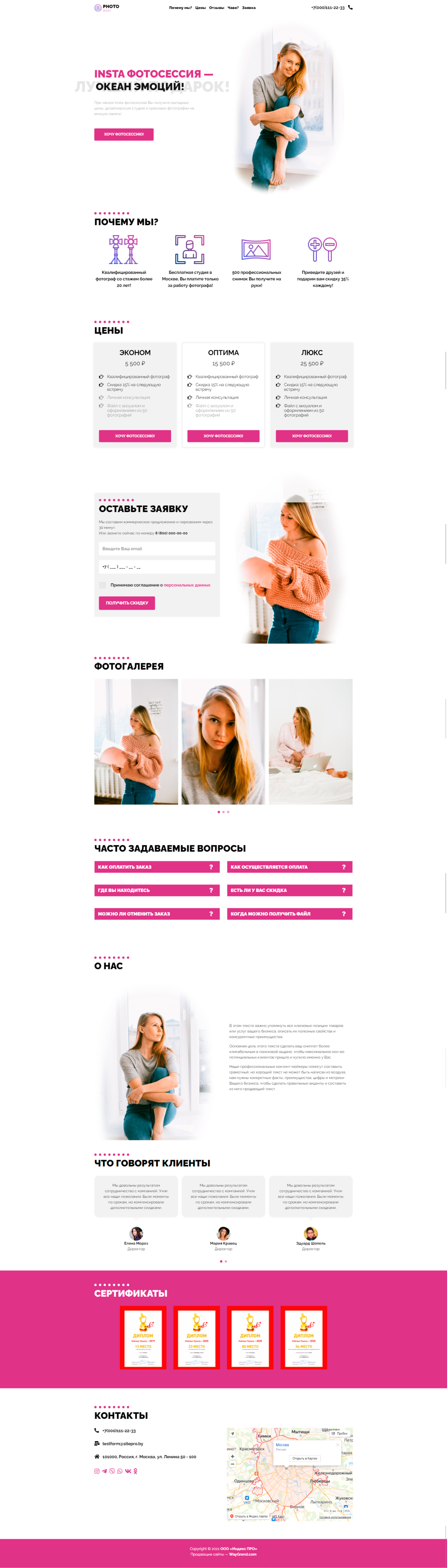 - Промоблок "INSTA ФОТОСЕССИЯ" с кнопкой призыва к действию "Хочу фотосессию"