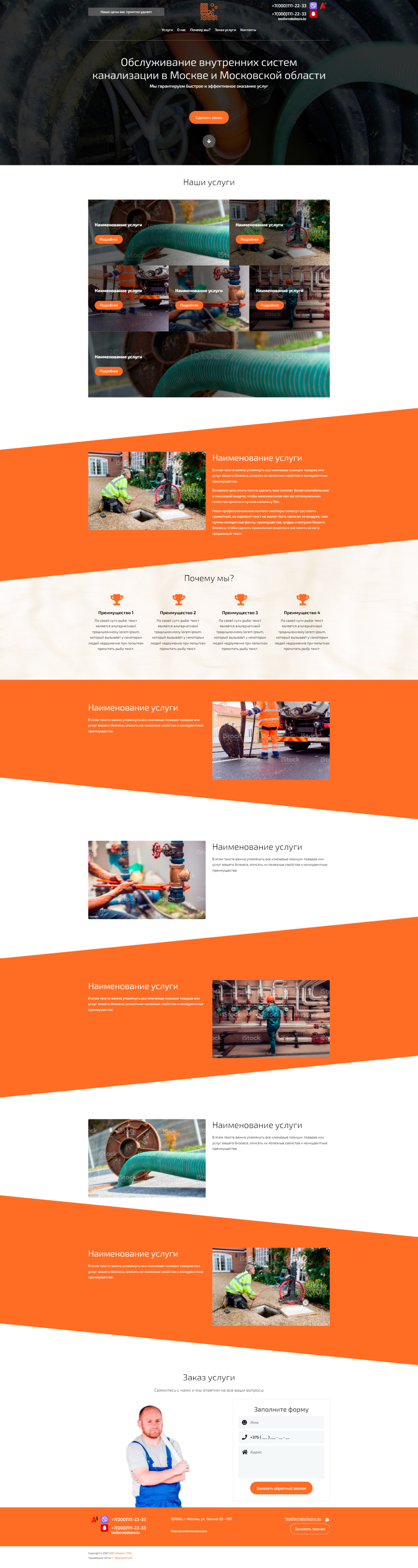 - Промоблок "Обслуживание внутренних систем канализации в Москве и Московской области" с кнопкой призыва к действию "Сделать заказ"