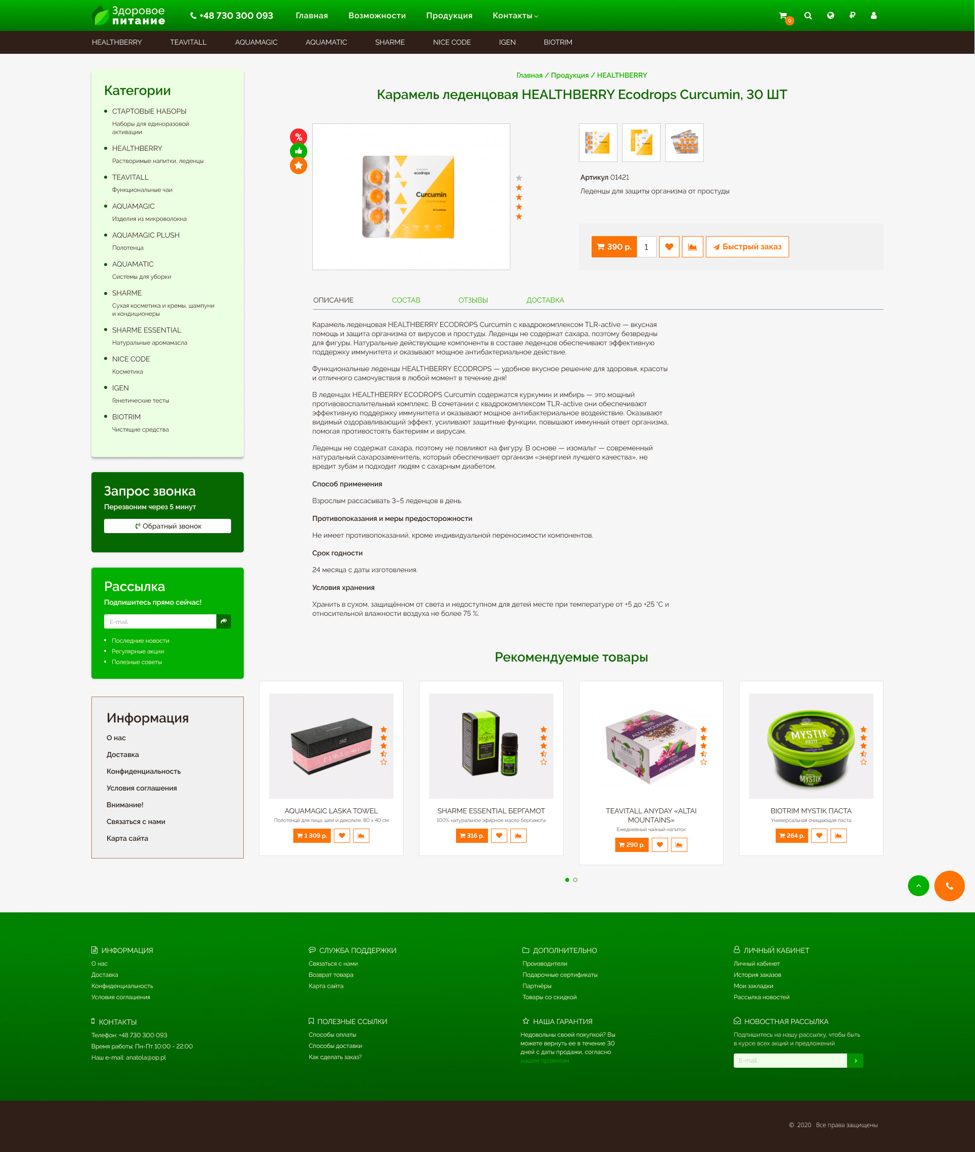 - Блоки "Категории", "Рекомендуемые", форма "Рассылка"